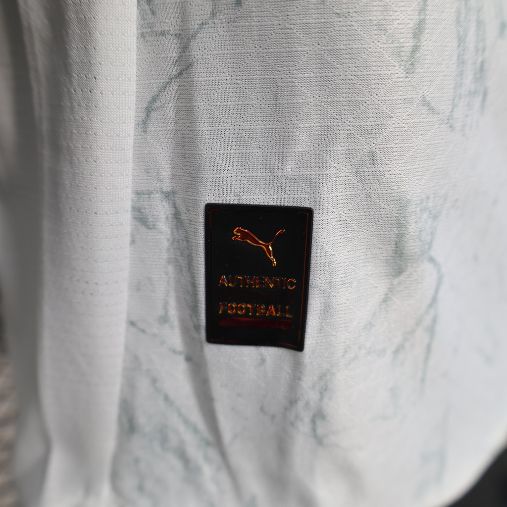 A camisa reserva do Manchester City 25/26 na versão Jogador masculina apresenta um design marcante com fundo branco e uma faixa diagonal em vermelho e preto que atravessa o peito, transmitindo imponência e estilo moderno. O escudo do City surge aplicado emborrachado no lado esquerdo, enquanto o logo está posicionado do lado direito. A gola redonda branca adiciona simplicidade, equilibrando a ousadia da estampa. Nos ombros, a malha respirável oferece conforto e desempenho em campo. Um manto alternativo que une tradição e inovação para os torcedores dos Citizens.