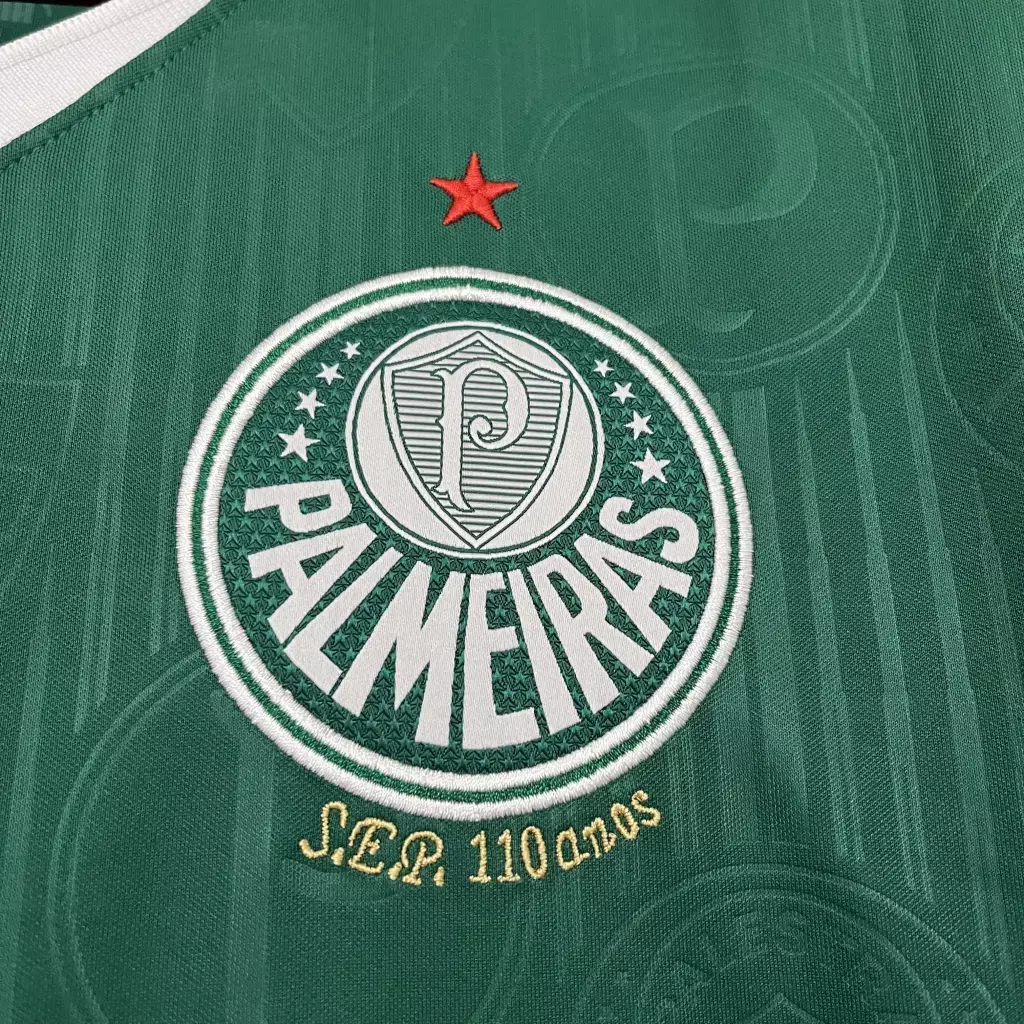 O manto titular do Palmeiras para a temporada 2024/25 traz o tradicional verde esmeralda com gola polo branca e punhos em contraste. O tecido possui leve textura com grafismos em relevo que remetem ao escudo e à história do clube. O escudo é bordado, com a inscrição “S.E.P. 110 anos” em dourado, celebrando mais de um século de glórias. Um manto que combina elegância e tradição para o torcedor alviverde.