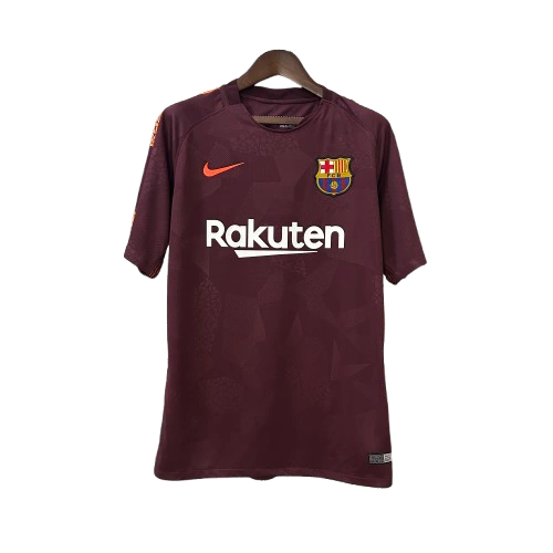 O manto retrô do Barcelona temporada 2017/18 na versão terceira camisa apresenta tom marrom predominante com grafismos geométricos em tom sobre tom espalhados pelo tecido. A gola é redonda na mesma cor, enquanto as mangas curtas mantêm acabamento simples. O escudo do clube aparece bordado no peito, destacando o design alternativo da época.