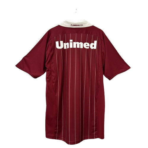 A camisa retrô do Fluminense terceira 2007/2008 apresenta o tom vermelho como base, com finas listras verticais brancas que dão destaque ao design clássico. A gola polo branca contrasta com o corpo do manto, enquanto as mangas curtas seguem o mesmo padrão, com acabamento em branco. O escudo do clube aparece bordado no peito, acompanhado das três estrelas, reforçando a tradição tricolor.
