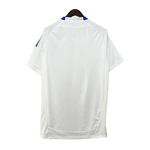 A camisa retrô do Lyon 2010/2011 é predominantemente branca, trazendo gola em “V” azul, mangas curtas e acabamento clássico. O manto possui faixas verticais em vermelho e azul no lado esquerdo, adicionando contraste ao design. O escudo do clube aparece bordado no peito, garantindo resistência e estilo atemporal.