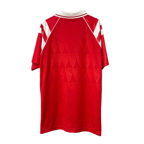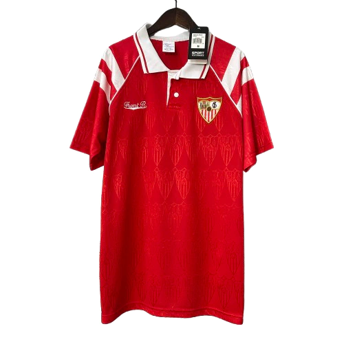 O manto retrô do Sevilla temporada 1992/93 na versão reserva é predominantemente vermelho, com grafismos em tom sobre tom espalhados pelo tecido. A gola polo branca traz detalhe em vermelho, enquanto as mangas curtas seguem o mesmo padrão, acompanhadas por faixas brancas nos ombros. O escudo bordado do clube aparece no peito, reforçando a tradição andaluza com acabamento de qualidade.