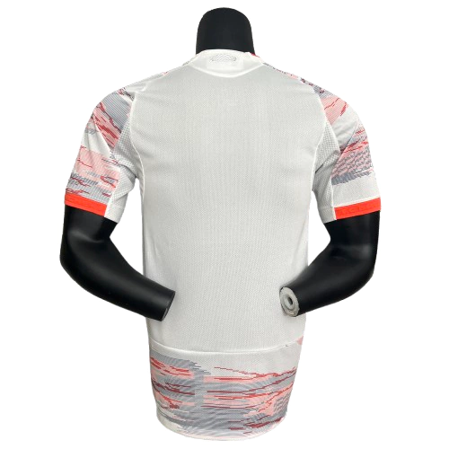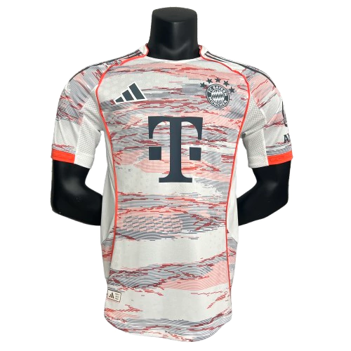 A camisa reserva do Bayern de Munique 2025/26 na versão Jogador masculina apresenta um design moderno e vibrante. A base branca recebe uma estampa gráfica abstrata em tons de vermelho e cinza, que se espalha por toda a parte frontal e mangas, criando um efeito dinâmico e chamativo. O escudo do Bayern aparece no lado esquerdo do peito em aplicação emborrachada monocromática preta, enquanto o logo no lado direito vem aplicado também emborrachado preto. A gola redonda branca com detalhe interno em vermelho garante contraste, acompanhada por mangas curtas que trazem detalhes em vermelho e cinza, além das tradicionais três listras pretas nos ombros. Um manto diferenciado, perfeito para colecionadores e torcedores que apreciam ousadia no uniforme.