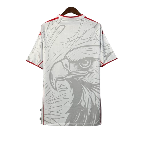 A camisa edição especial do Benfica 2025/26 chega em um elegante tom branco com grafismo cinza em formato de águia, símbolo máximo do clube, estampado em toda a parte frontal. O design ganha ainda mais destaque com os detalhes em vermelho nas três listras dos ombros, punhos e na gola redonda. O escudo bordado no peito esquerdo reforça a tradição encarnada. Um manto único, feito para os torcedores que carregam a águia e sua história com orgulho.