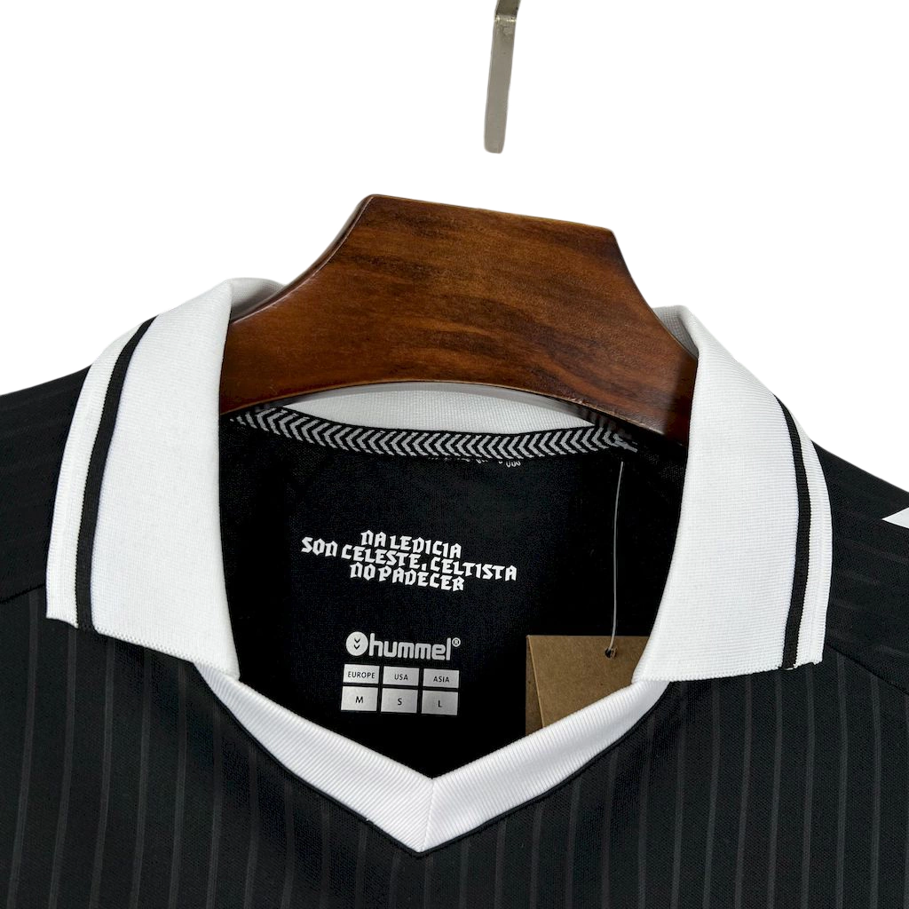 O manto preto do Celta de Vigo em comemoração aos 100 anos é elegante e marcante, trazendo um visual sóbrio que valoriza o centenário do clube. O design apresenta fundo preto com finas listras verticais em marca d’água, criando textura sofisticada. A gola polo em branco com detalhe em preto reforça a identidade clássica, enquanto as mangas curtas recebem acabamento branco nas extremidades. O escudo comemorativo bordado no peito esquerdo simboliza a história do clube, acompanhado pelo logotipo bordado no lado oposto. Um uniforme que une tradição e modernidade, ideal para colecionadores e torcedores apaixonados.