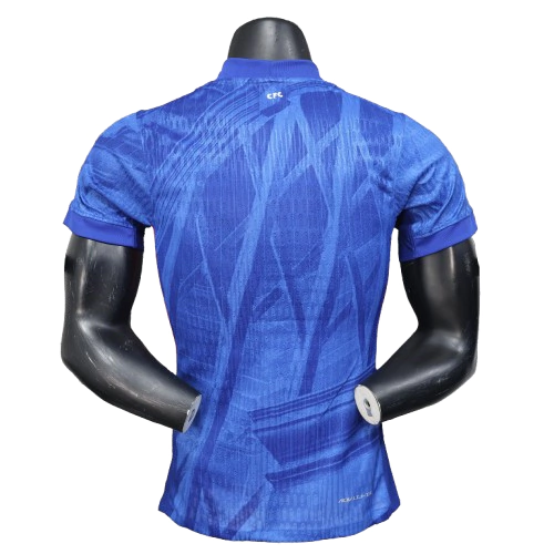 A camisa titular do Chelsea temporada 25/26 na versão Jogador masculina apresenta um design moderno e tecnológico que reforça a identidade do clube londrino. O modelo é predominantemente azul, com grafismos geométricos em diferentes tons que criam um efeito dinâmico no tecido. O escudo aparece aplicado emborrachado no lado esquerdo do peito. A gola em “V” estilizada mescla azul e branco, e os punhos acompanham o acabamento na mesma paleta. Um manto de alta performance desenvolvido para desempenho e estilo.