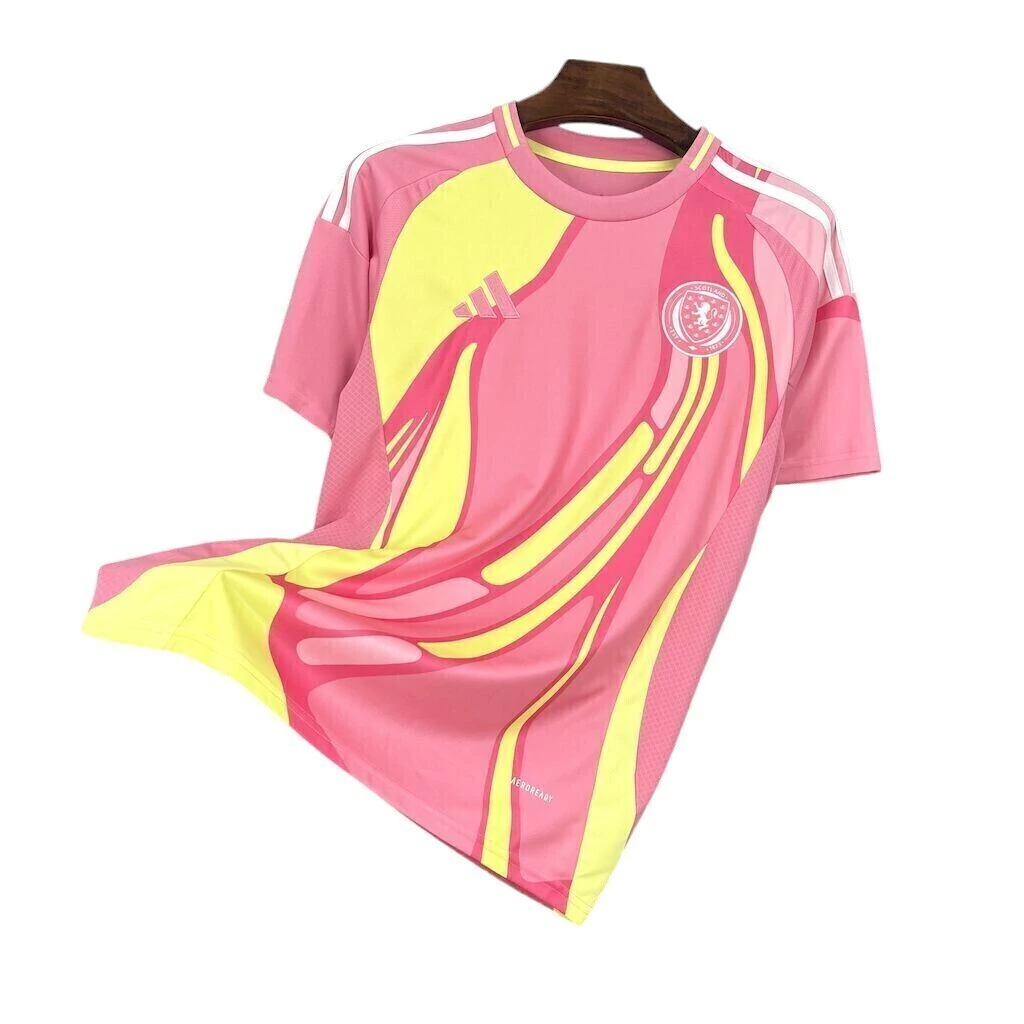 A segunda camiseta da Escócia para a temporada 2025/26 aposta em um design ousado e contemporâneo. O manto tem base rosa clara com grafismos em tons mais fortes de rosa e amarelo, que se misturam em curvas modernas pela parte frontal e mangas. A gola redonda vem em rosa, harmonizando com o conjunto, enquanto as mangas curtas mantêm acabamento liso. O escudo aparece bordado no peito esquerdo em branco e rosa, enquanto o logotipo também bordado ocupa o lado direito. Um manto diferenciado que combina estilo e irreverência para torcedores e colecionadores.