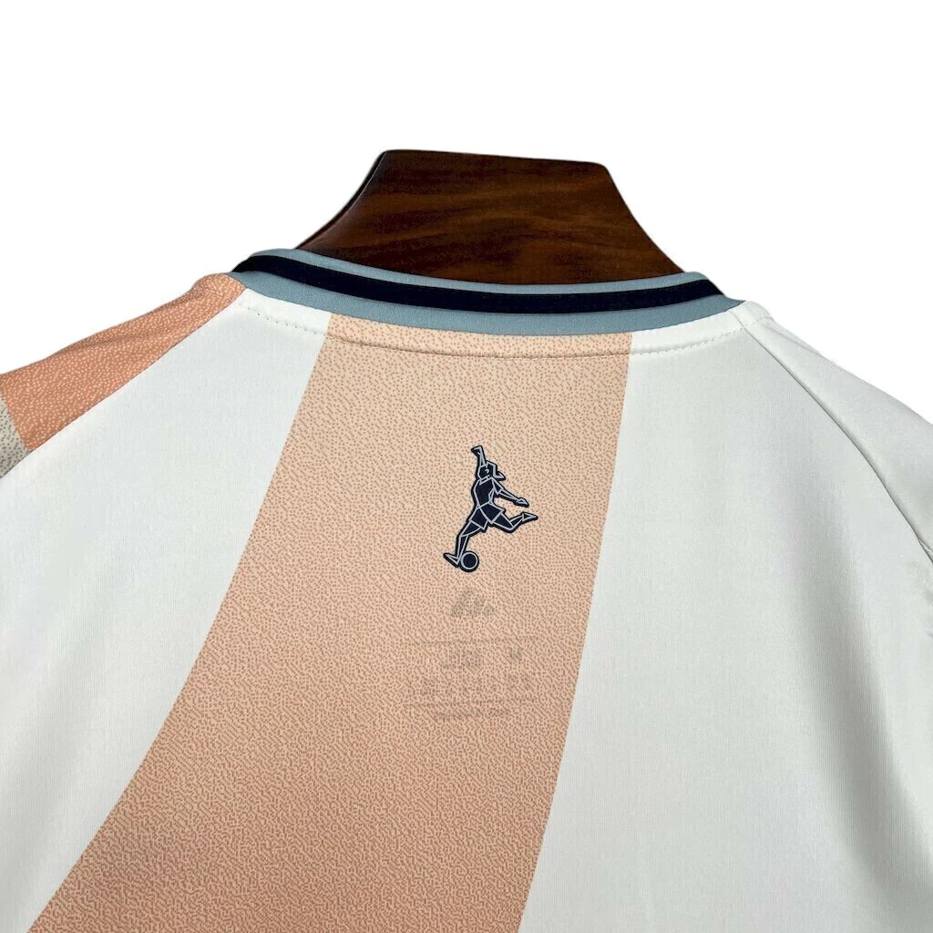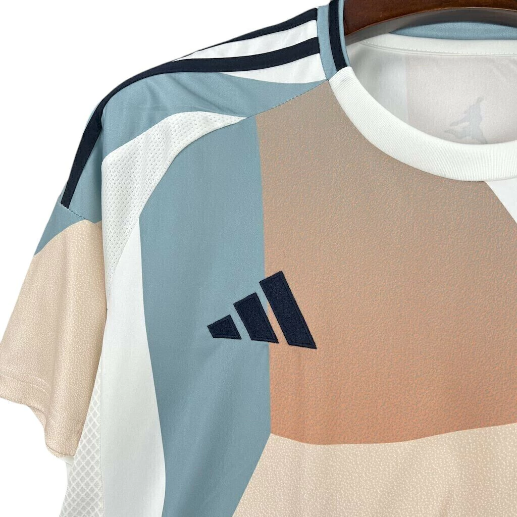 O manto titular da seleção da Espanha para a temporada 2025/26 apresenta um design contemporâneo e ousado. A camisa é predominantemente branca e recebe uma estampa geométrica multicolorida em tons de bege, laranja, azul e preto, criando um visual artístico e inovador. A gola redonda branca mantém o equilíbrio visual, enquanto as mangas curtas seguem o padrão minimalista do modelo. O tecido leve oferece conforto e respirabilidade. O escudo da Espanha surge em aplicação emborrachada, garantindo autenticidade e sofisticação ao uniforme.