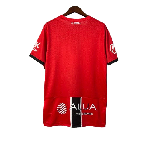 O manto principal do Mallorca para a temporada 2025/26 se destaca pelo visual moderno e imponente. Com base vermelha vibrante, a peça traz uma faixa central preta em toda a vertical com filete branco que reforça o contraste. A gola em formato careca preta com detalhe interno vermelho mantém a proposta clean e equilibrada. O escudo do clube aparece aplicado no lado esquerdo do peito. Um uniforme que une tradição e ousadia com equilíbrio visual.