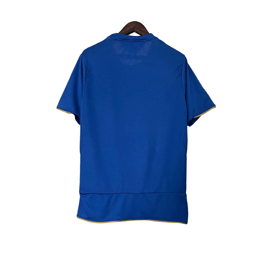 A camisa retrô do Chelsea 2005/06 celebra o centenário do clube com design clássico em azul royal e detalhes dourados. O escudo bordado com inscrição “1905-2005” marca os 100 anos dos Blues, acompanhado de gola careca reforçada e ombros com inserções douradas. Um manto histórico que remete à era Umbro, símbolo de tradição e elegância londrina.