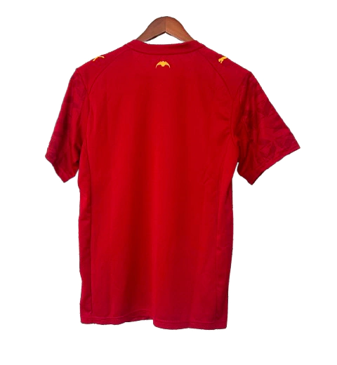 A camisa reserva do Valencia temporada 25/26 aposta em um visual ousado com base totalmente vermelha e detalhes em amarelo vibrante. O escudo do clube aparece no peito em versão moderna com acabamento emborrachado termocolante, acompanhado do logo da fornecedora na mesma tonalidade. O design traz um padrão gráfico geométrico em tom sobre tom, presente na frente e costas, reforçando o estilo marcante do manto. A gola redonda simples e as mangas seguem o padrão monocromático, deixando o destaque para o grafismo e os contrastes visuais.