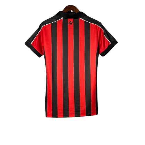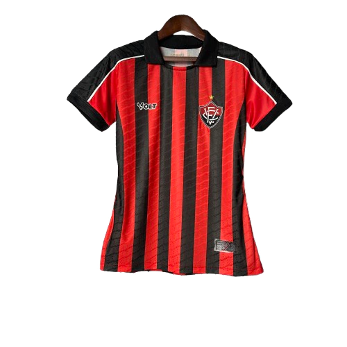 A camisa titular do Vitória para a temporada 2025/26, na versão feminina, mantém o tradicional visual listrado vertical em vermelho e preto com um toque moderno nos detalhes. A peça conta com gola polo preta, aplicação em recorte branco nos ombros e um padrão gráfico em toda a extensão das listras. O escudo do clube aparece aplicado bordado com acabamento refinado no lado esquerdo do peito. Um manto feminino que valoriza as raízes do clube com estilo e presença.