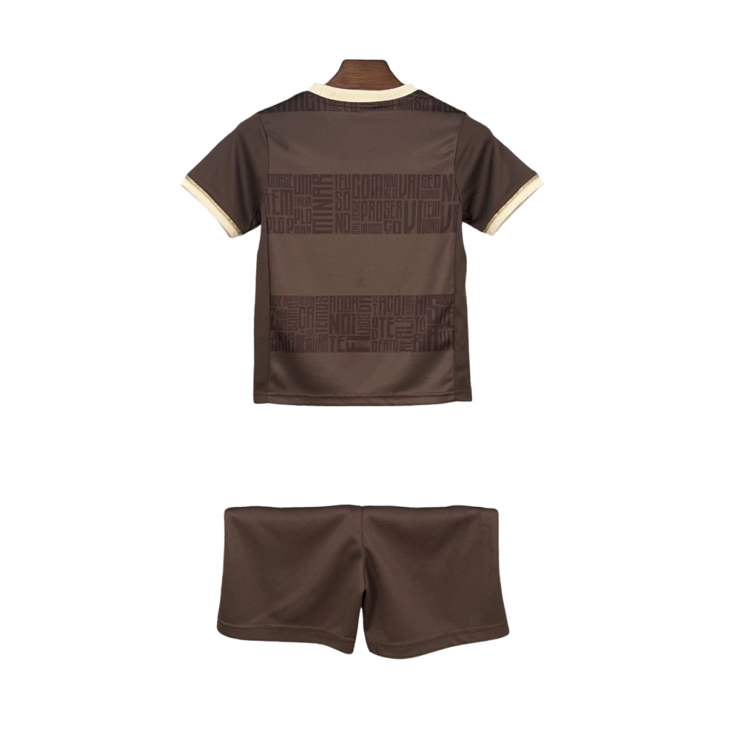 O conjunto infantil do Flamengo para a coleção Consciência Negra 2024/25 apresenta tom marrom como base, com gola redonda bege e mangas curtas com detalhes em contraste. O escudo em dourado aparece aplicado bordado no peito e também no short. O corpo traz grafismos geométricos em tonalidade mais escura, criando textura moderna e acabamento sofisticado.